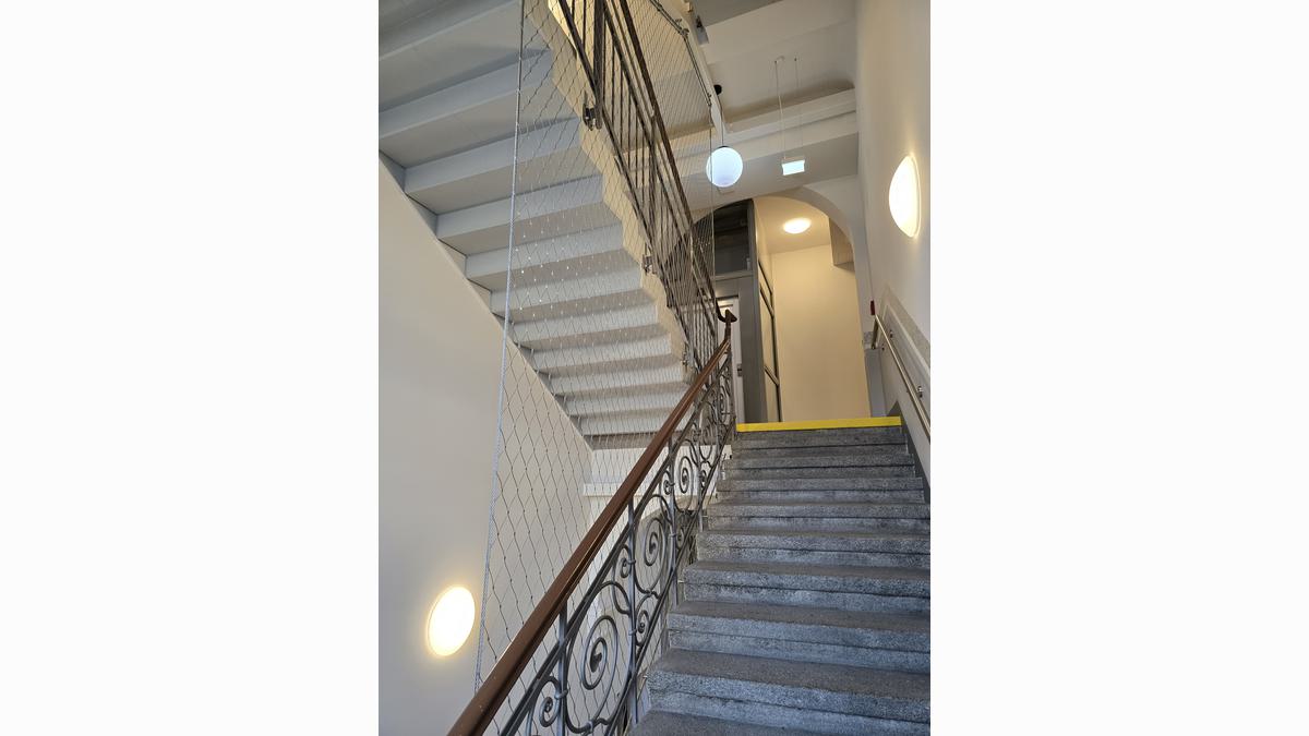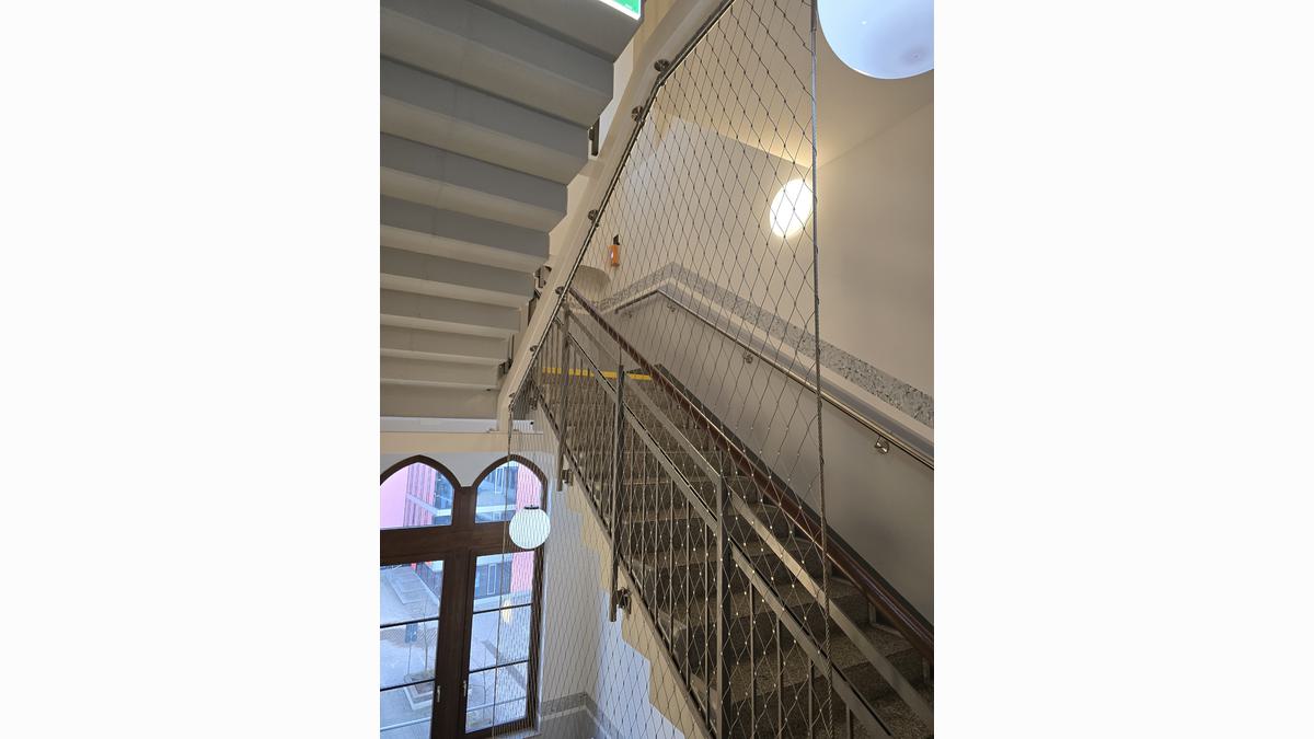 Denkmalschutz und baurechtliche Anforderungen vereint das montierte Edelstahlnetz, welches als Absturzsicherung dient, aber dabei die historische Optik der Geländer nicht zerstört.