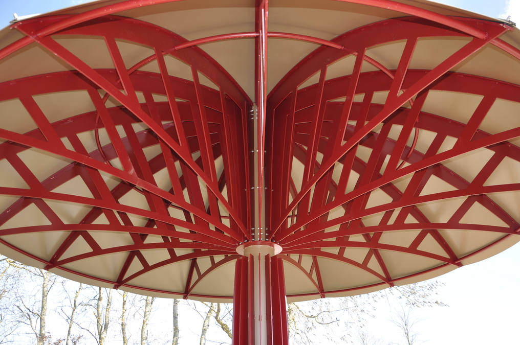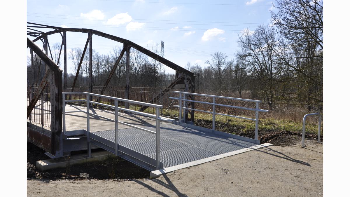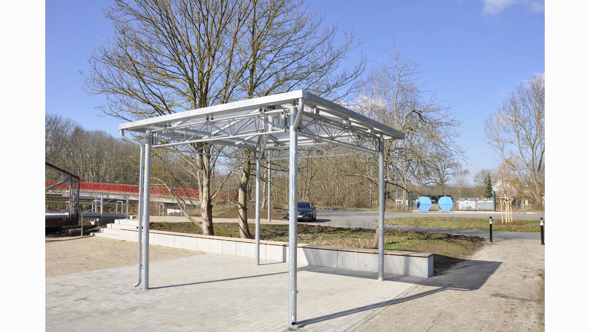 Wir durften die Interventionsfläche „Rastplatz am Chemnitztal-Radweg mit Fischwegbrücke“ mitgestalten – farbige Fahrradständer die das Wort Chemnitz bilden, ein Pavillon für kulturelle Beiträge und Wetterschutz und die Rampe, welche die alte Fischwegbrücke barrierefrei